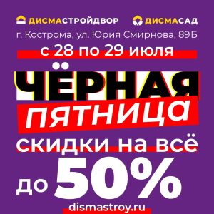 28 и 29 июля в строительном гипермаркете ДИСМА (г.Кострома, ТЦ Стометровка, ул.Юрия Смирнова, 89Б) скидки на всё до 50%! В эти дни…