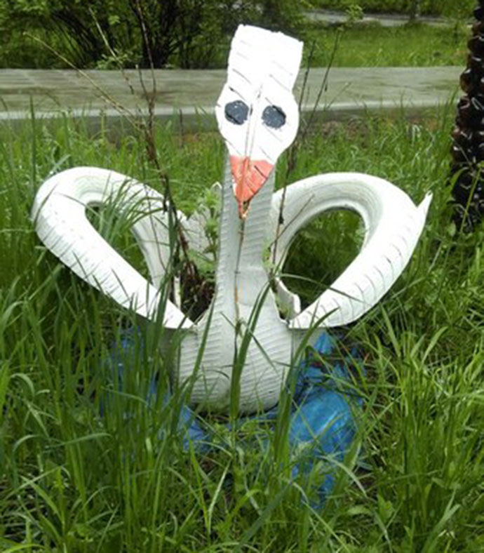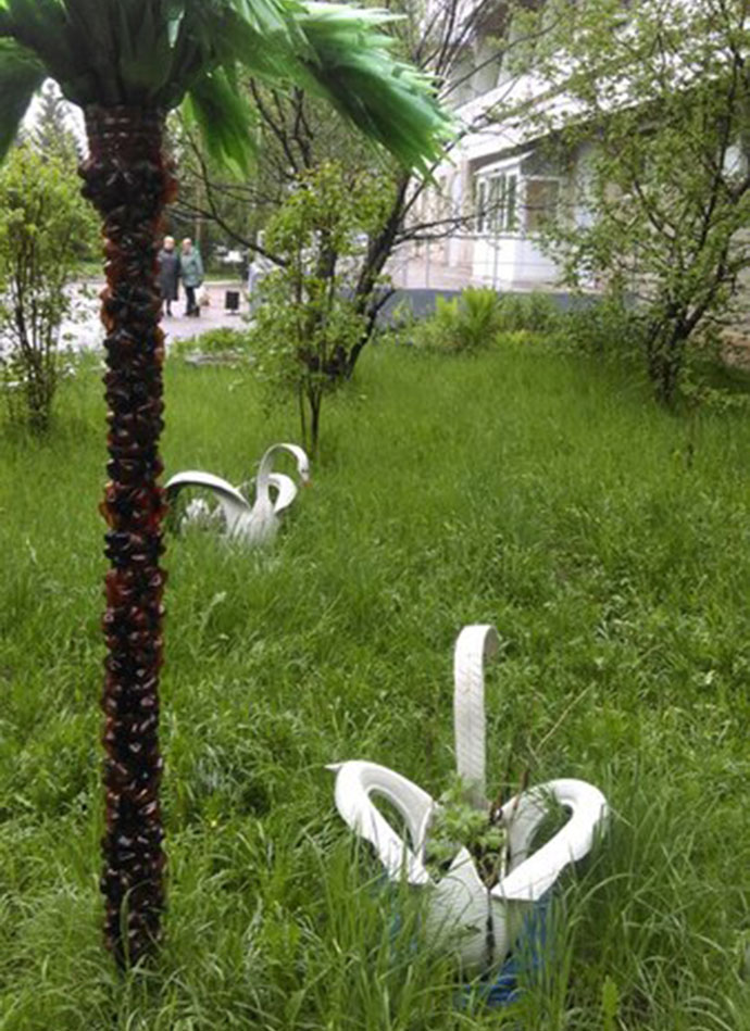 Так, в Костроме, у поликлиники на Профсоюзной из старых шин умельцы смастерили лебедей. Кстати, рядом – пальмы из пластиковых бутылок.